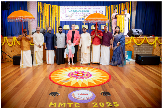 Melbourne Marthoma Church organized Onam Fiesta on Saturday, 13 Sept 2025 at St Matthew's Parish Hall, Fawkner. Acting Speaker and Victorian Parliamentarian Lauren Kathage MP was the chief guest. Rev. Fr. Jibin Sabu, Vicar of St. George Indian Orthodox Church, attended as the special guest. Kathage inaugurated the celebrations by lighting the lamp, followed by the Onam message delivered by Rev. Fr. Jibin Sabu.